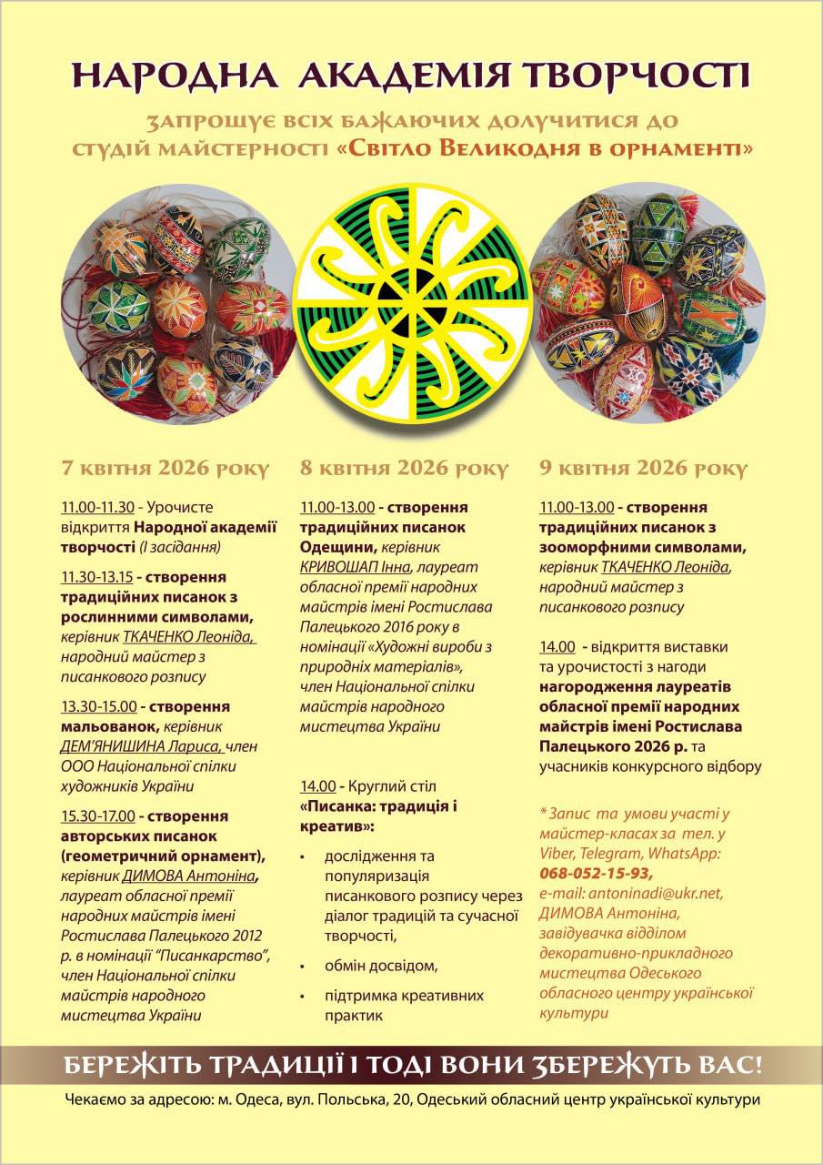 Одеський обласний центр української культури в рамках XI обласного багатожанрового фестивалю дитячої творчості «Весняне різнобарв’я» з 24 по 27 березня 2026 року проводить обласні дитячі свята з писанкарства «Воскресни, писанко!», з витинанки «Паперове мереживо», з декоративного розпису «Жар-птиця» та з традиційної народної керамічної іграшки “Я Коза-Дереза” на загальну тему: «Ходить гарбуз по городу» (символи достатку, урожаю, родючості, зародження життя, єднання роду, родинні зв’язки тощо):