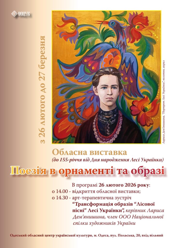 До Дня народження видатної української поетеси Лесі Українки відкриваємо обласну виставку «Поезія в орнаменті та образі». Експозиція об’єднує роботи сучасних художників, натхненних поетичним словом, драматургією та непохитним духом Лесі Українки. У представлених полотнах — образи Мавки і Лукаша, мотиви «Лісової пісні», символіка боротьби, любові й свободи, що проходять крізь усю творчість письменниці.